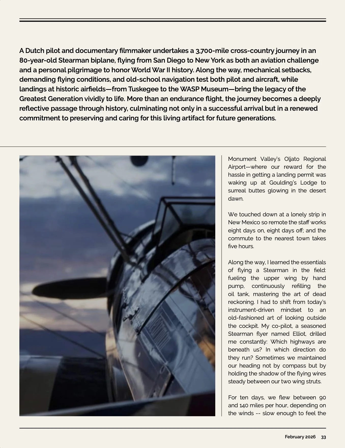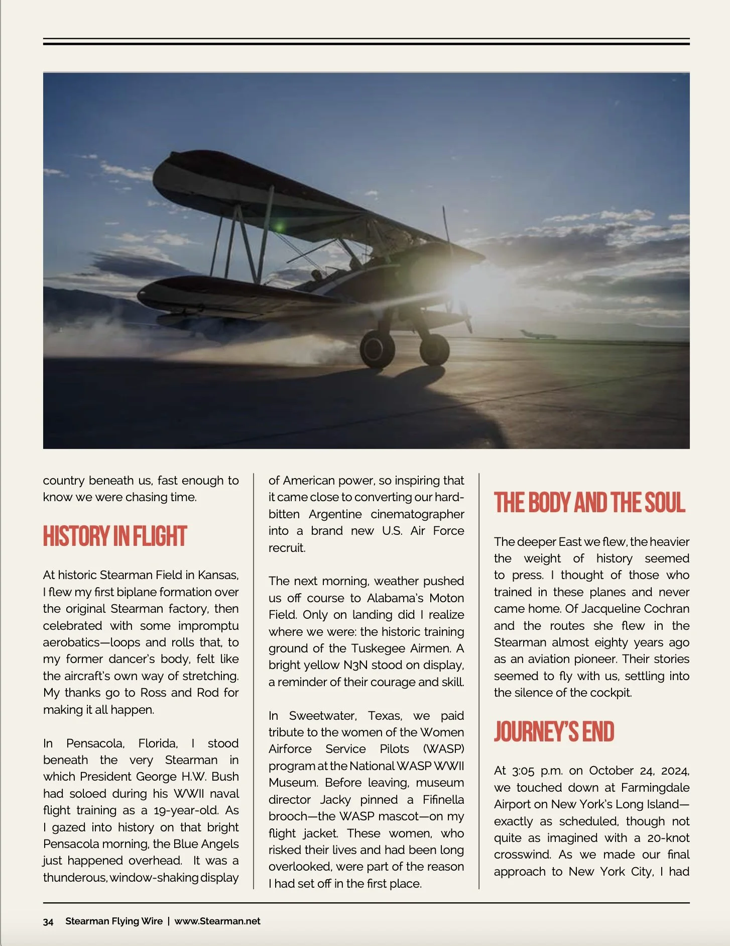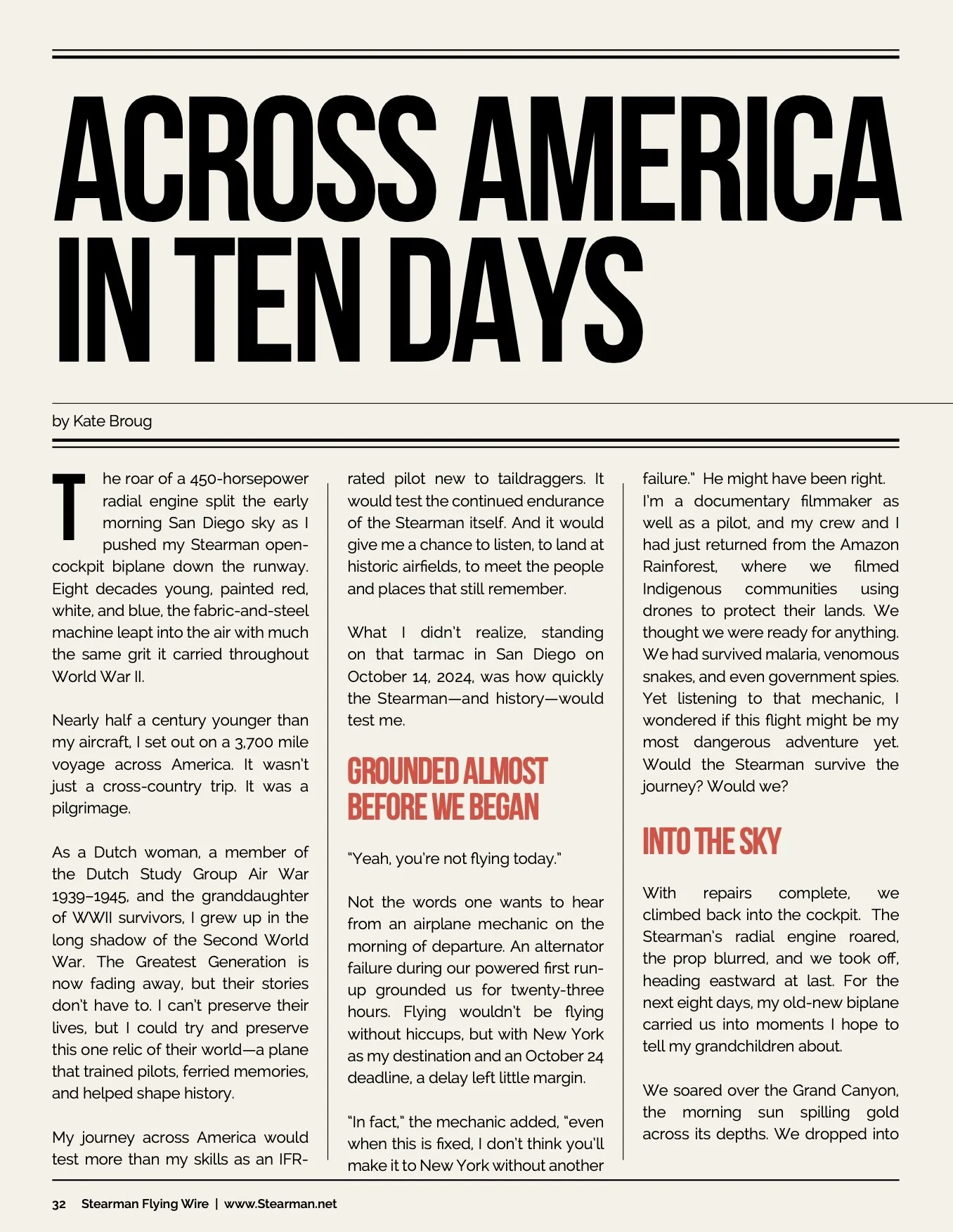 Published in the February issue of Flying Wire, the magazine of the Stearman Restorers Association, Kate Broug writes about her ten-day flight from San Diego to New York in a 1943 Boeing Stearman.